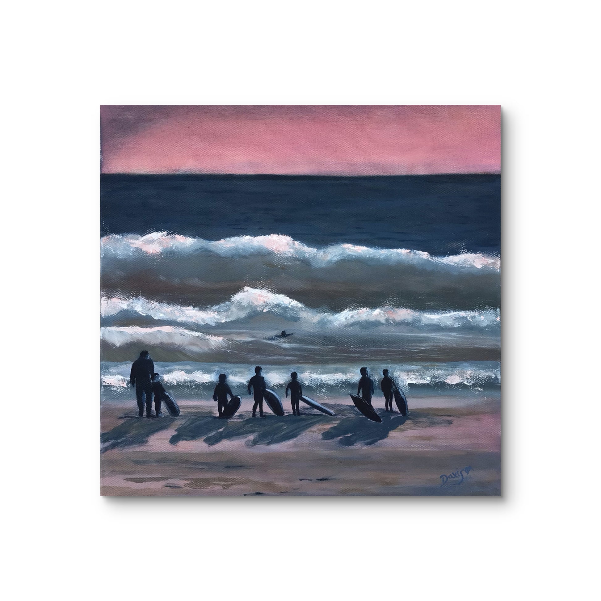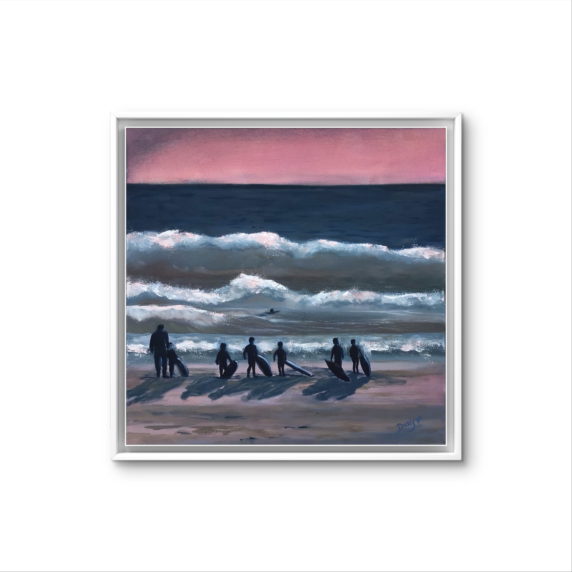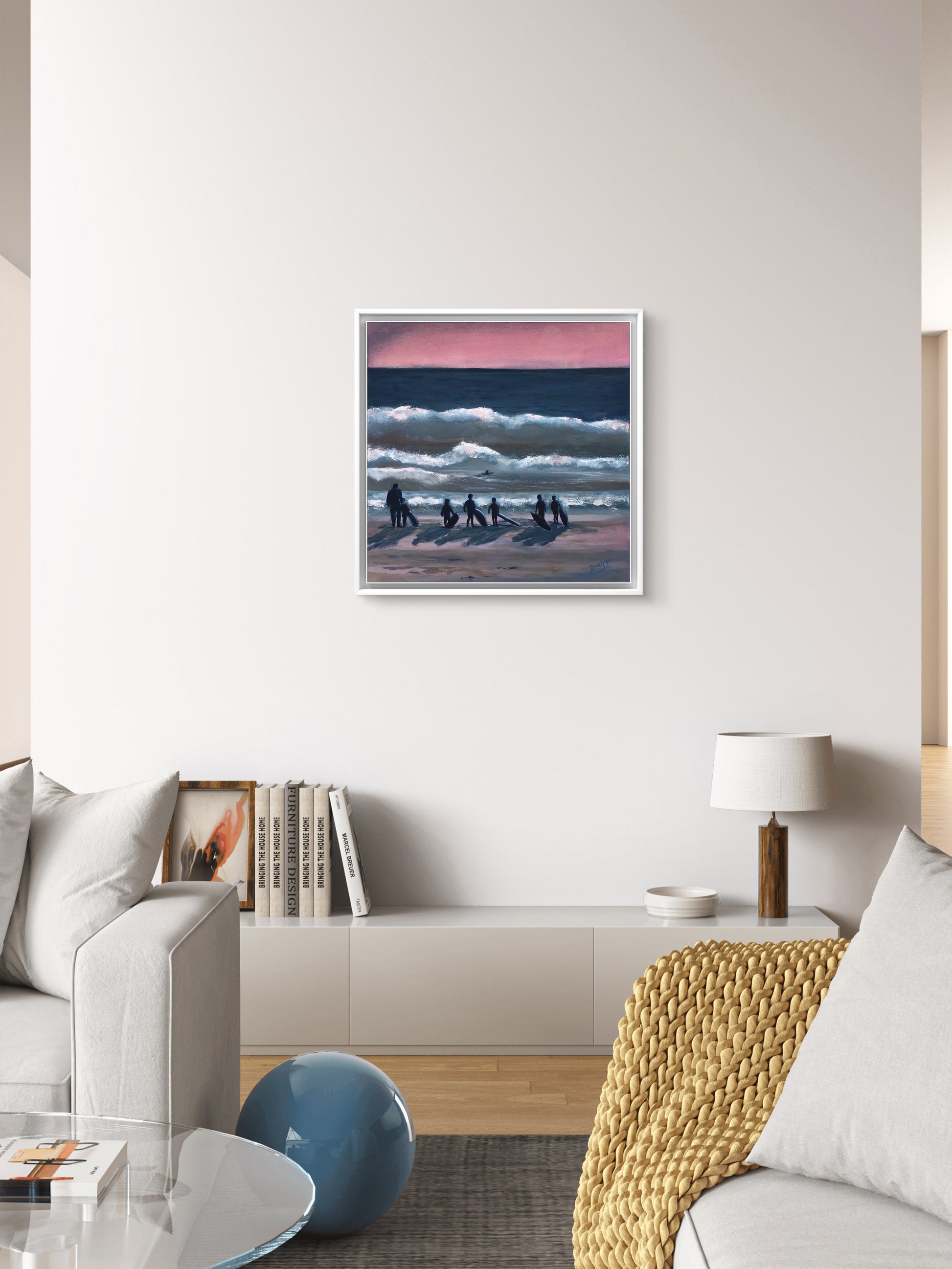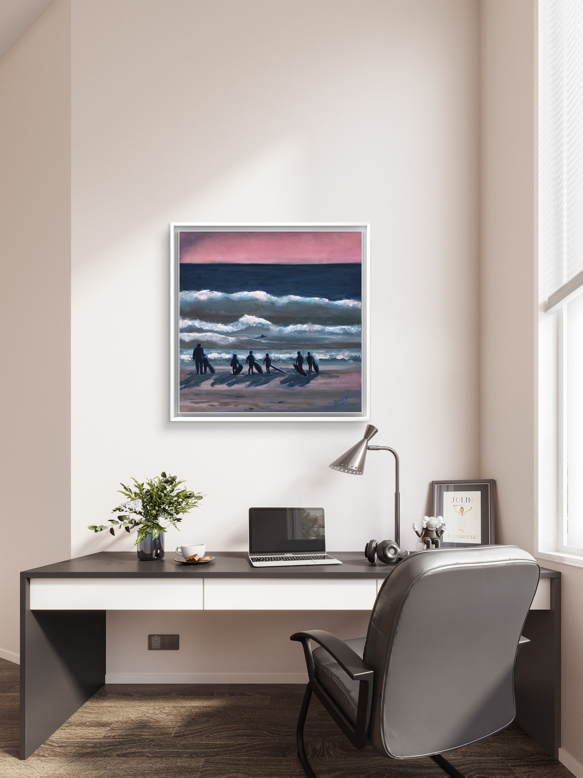This one is for all of us who love the sea- to surf, to swim, to bodyboard or just splash around. Anticipation captures the moments before a surf school enter the water at Watergate Bay in Cornwall- those feelings of excitement and anticipation before they wade into the cold, powerful and exhilarating waves. Painted in oil, the picture, measuring 40x40 cm, is framed in a white wooden floating frame and is ready to hang
