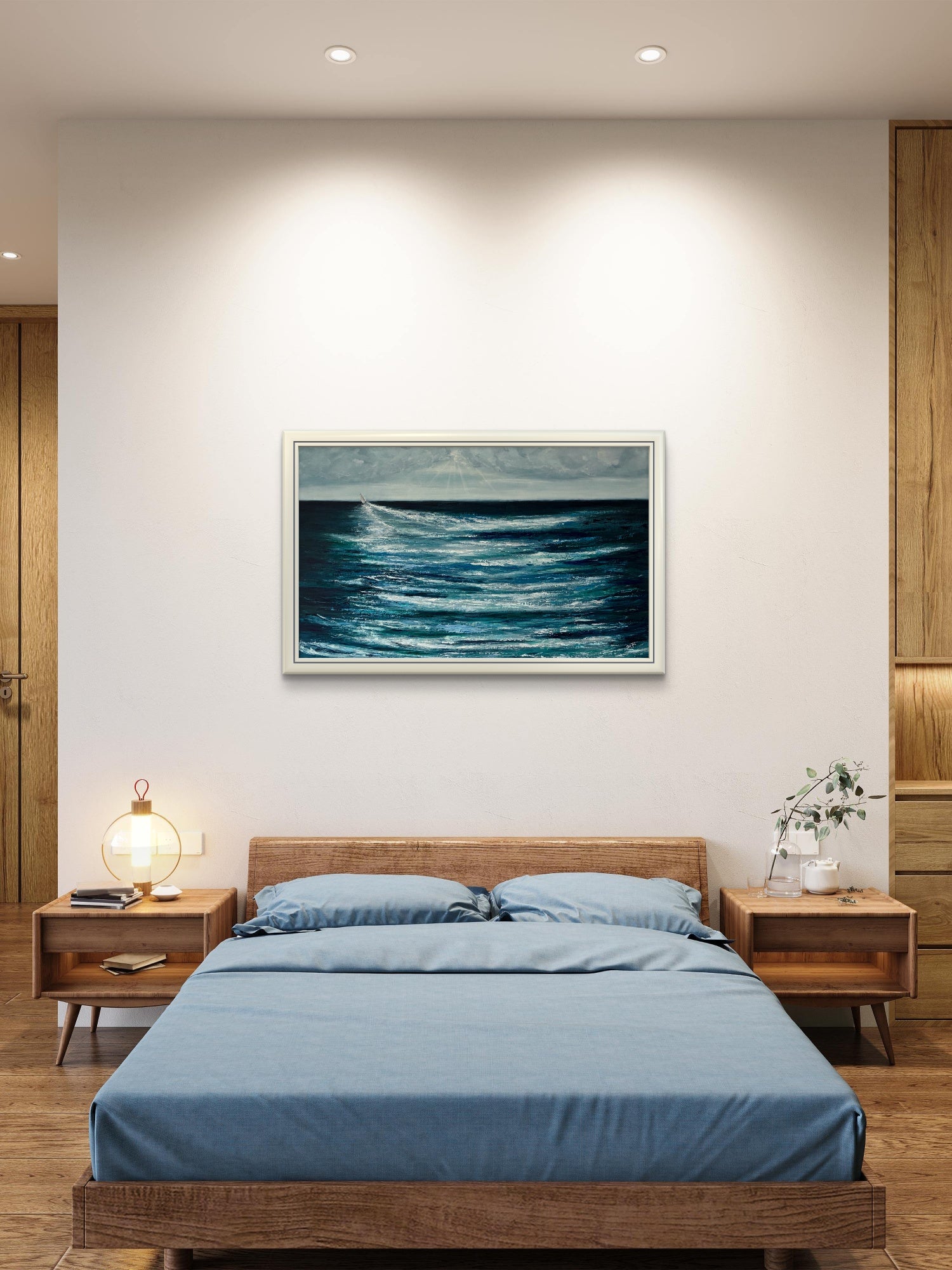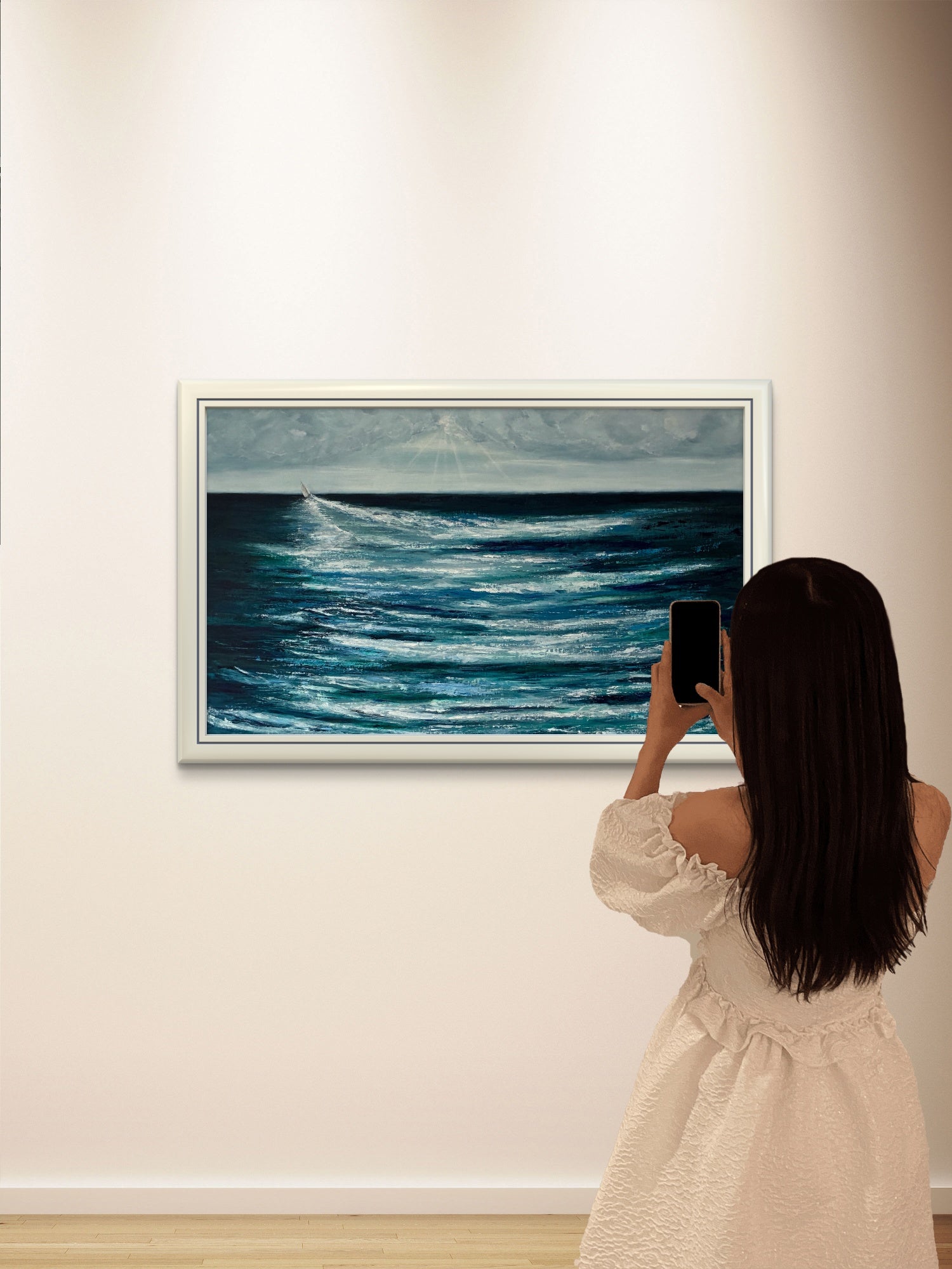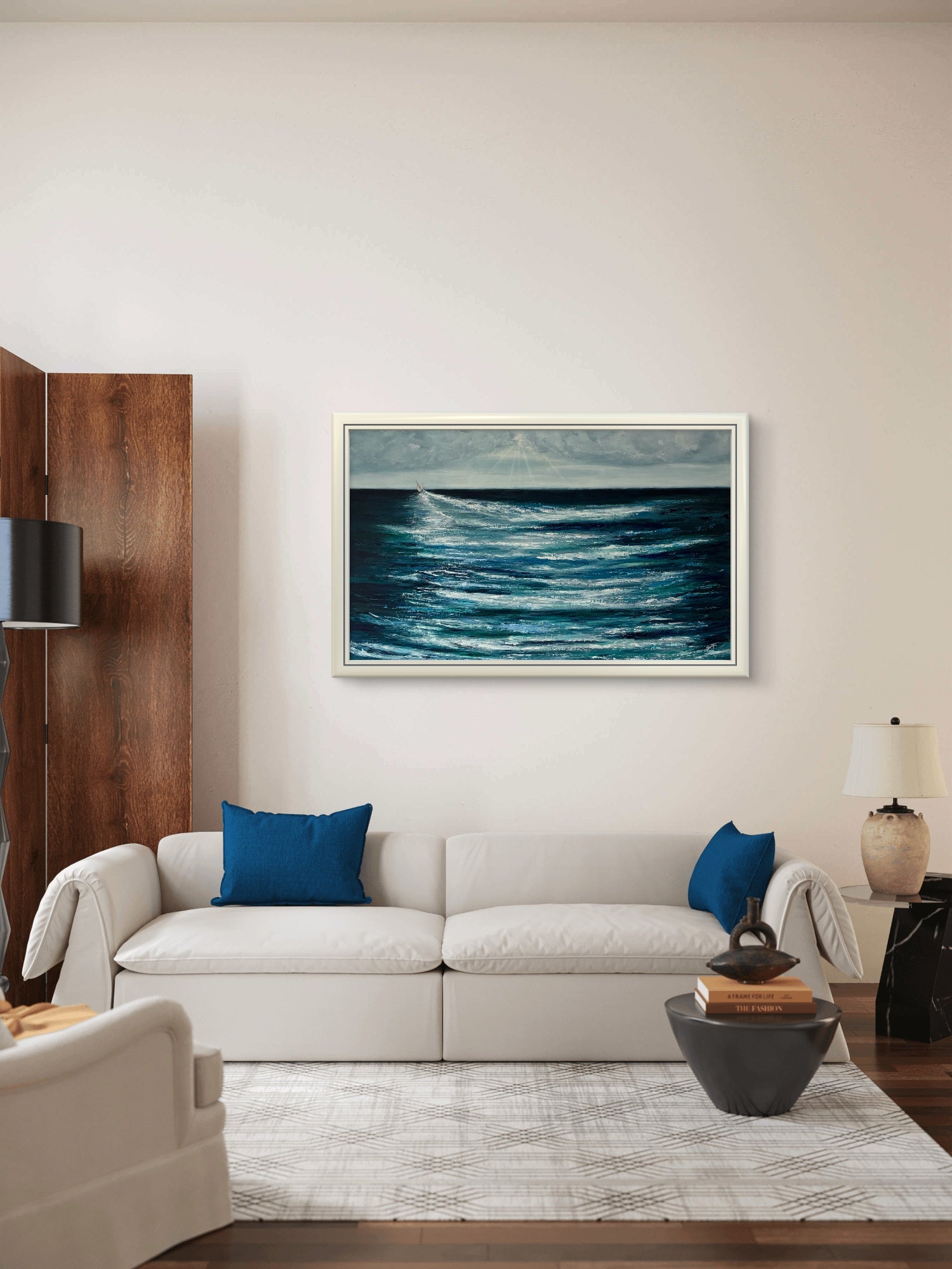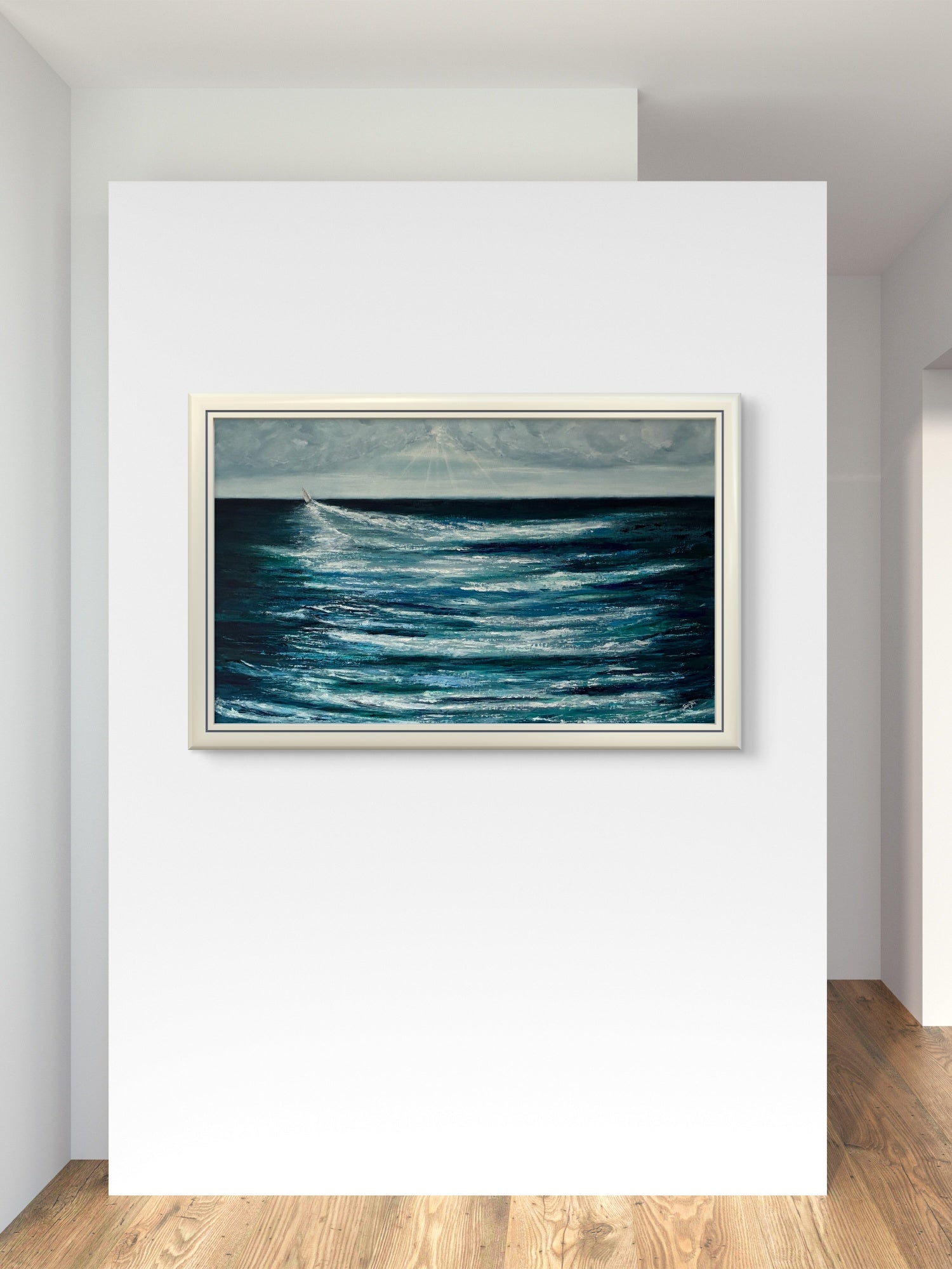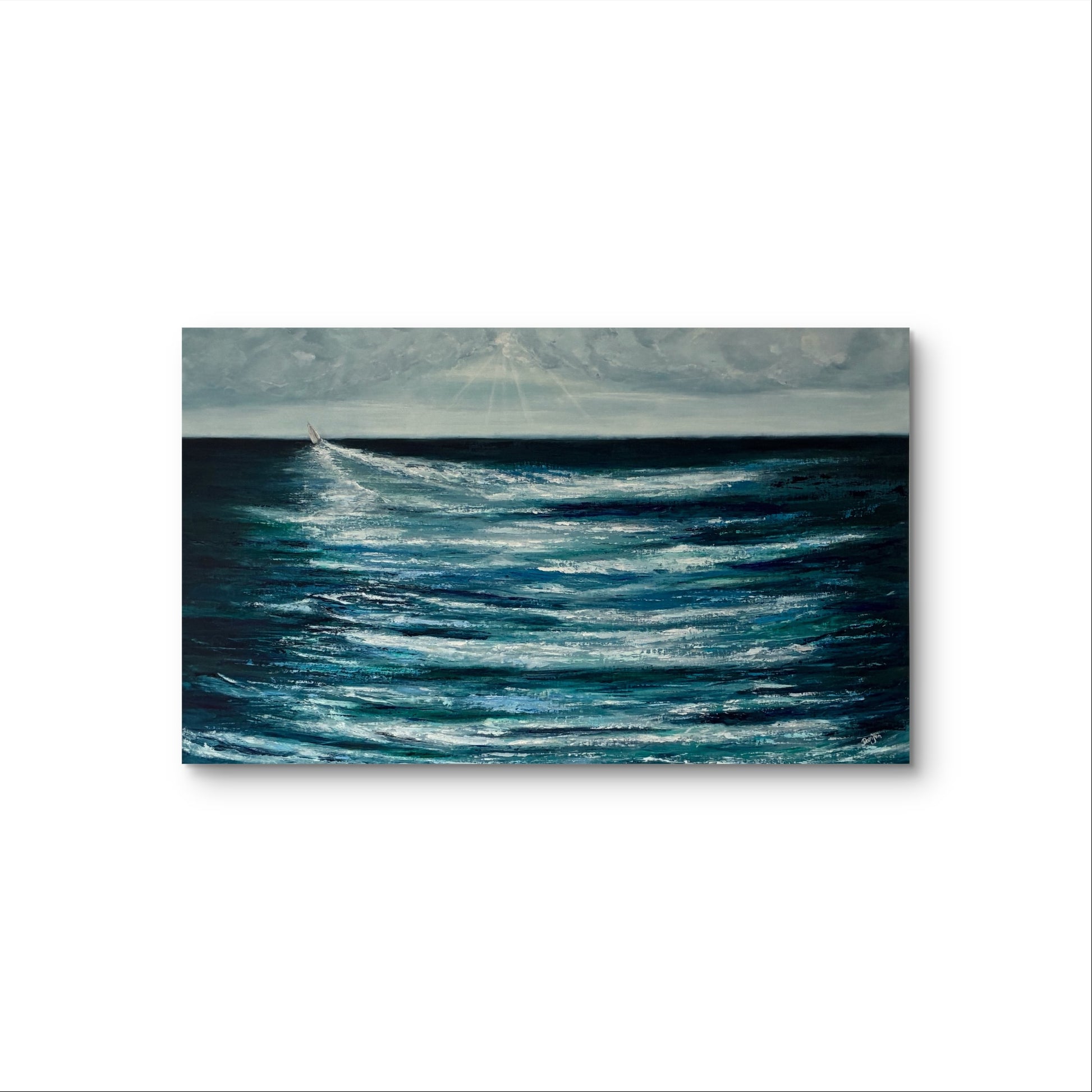 Celebrating the adventurous spirit of those that take to the seas, facing into the challenges of the ocean and setting course over the horizon. In a world of constraint, division and technology proliferation it’s good to remember that beautiful, more simple, life enhancing opportunities within our natural environment still exist and provide a counter balance. Painted in oil on board, the blue and green hues of the ocean are broken by the wash of the yacht as it changes course and heads west, with heavy skies ahead. The painting measures 125x75cm and is framed in a white wooden frame which is also waxed with white wax. The rear of the painting is sealed and is ready to hang.