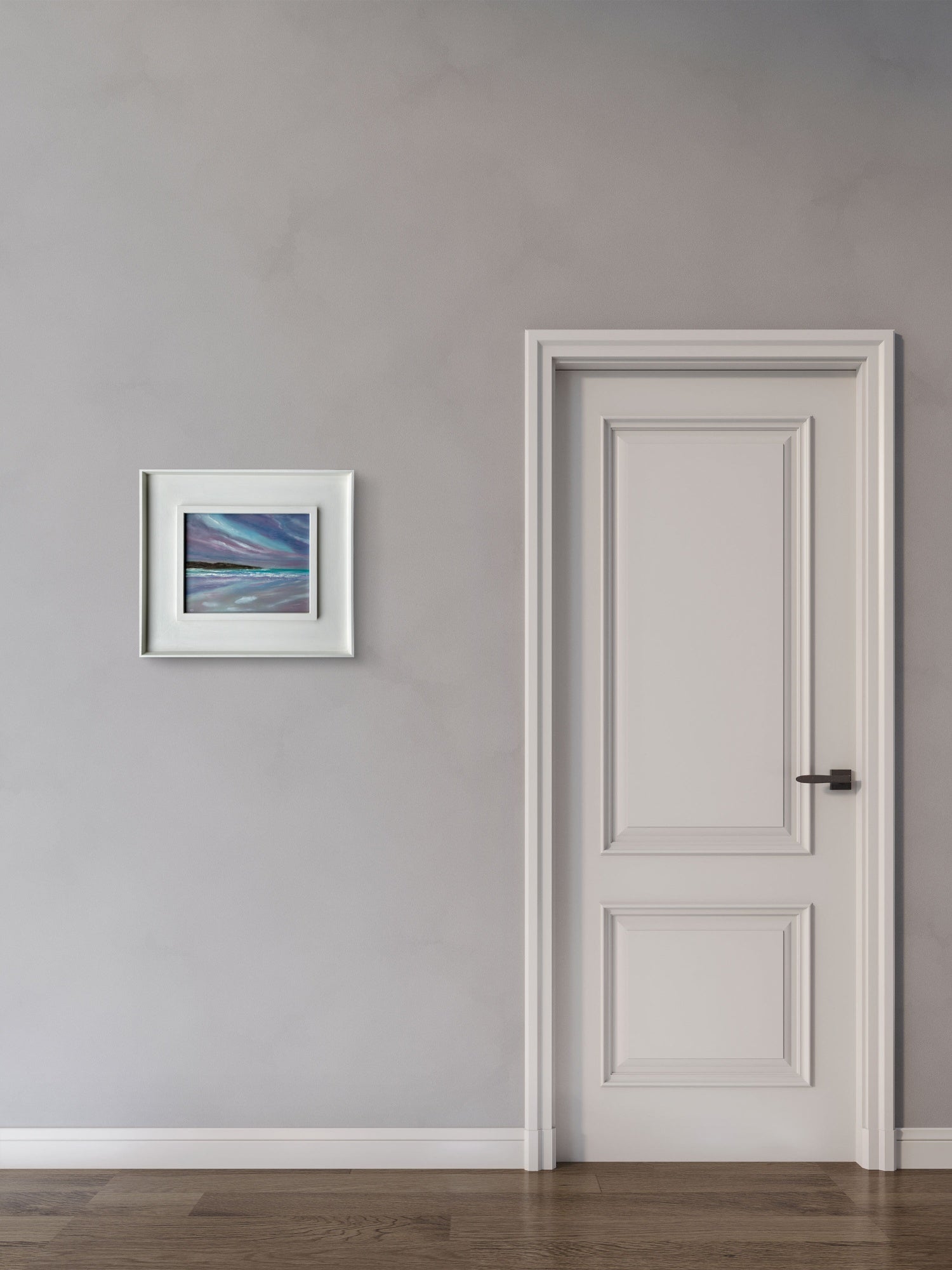 Reflections is a celebration of nature’s ability to amaze us with the beauty that it creates. Set in the early evening down on one of Cornwall’s finest beaches, the magenta and violet hues from the evening skies are mirrored in the wet sands of the receding tide, set off by the brilliance of the turquoise water. The picture radiates a sense of calm and will grace any room in the house. It is painted in traditional oils on wooden board, measures 10x8, and is framed in a white, wider St Ives wooden frame. The picture is ready to hang.