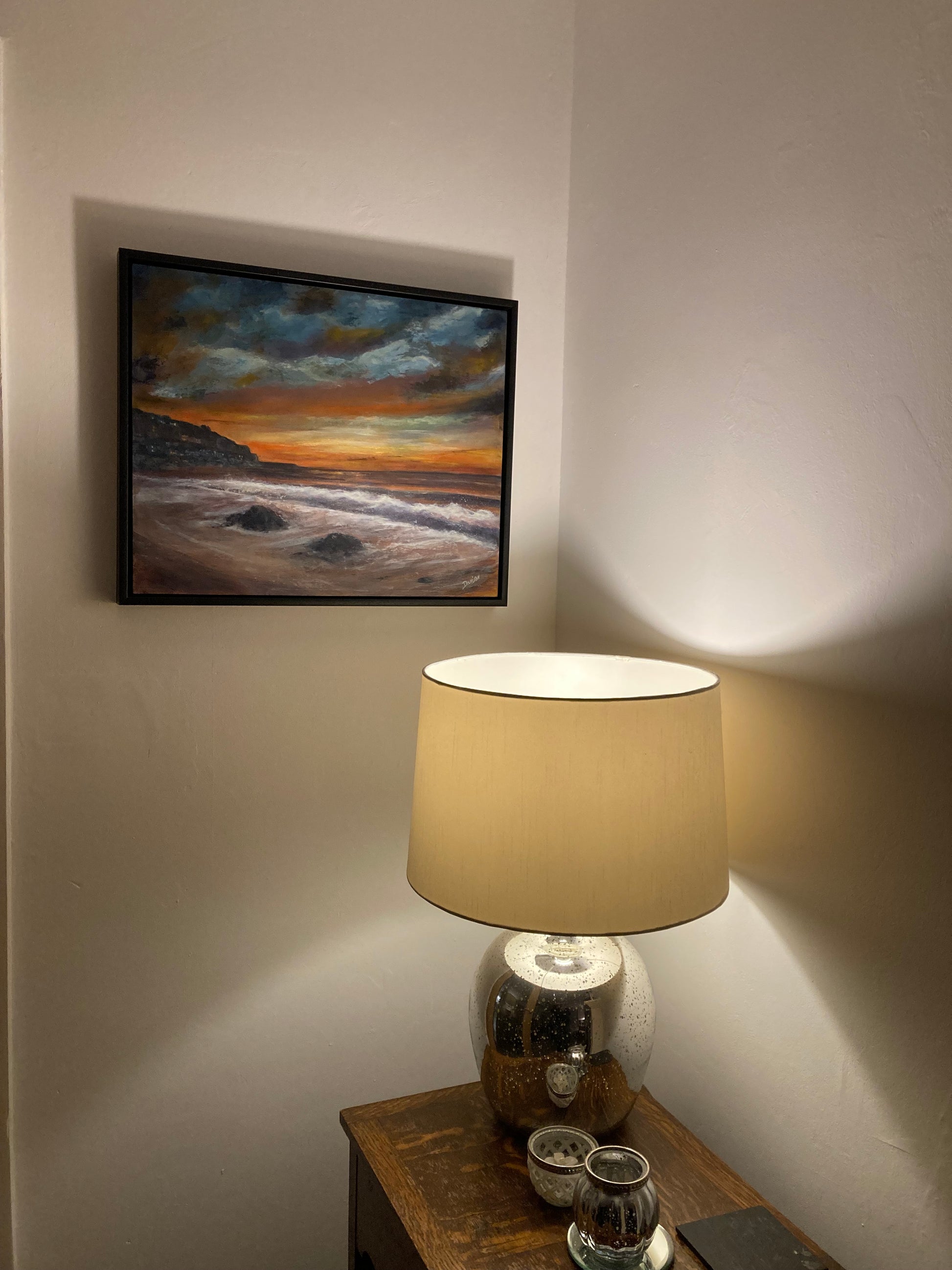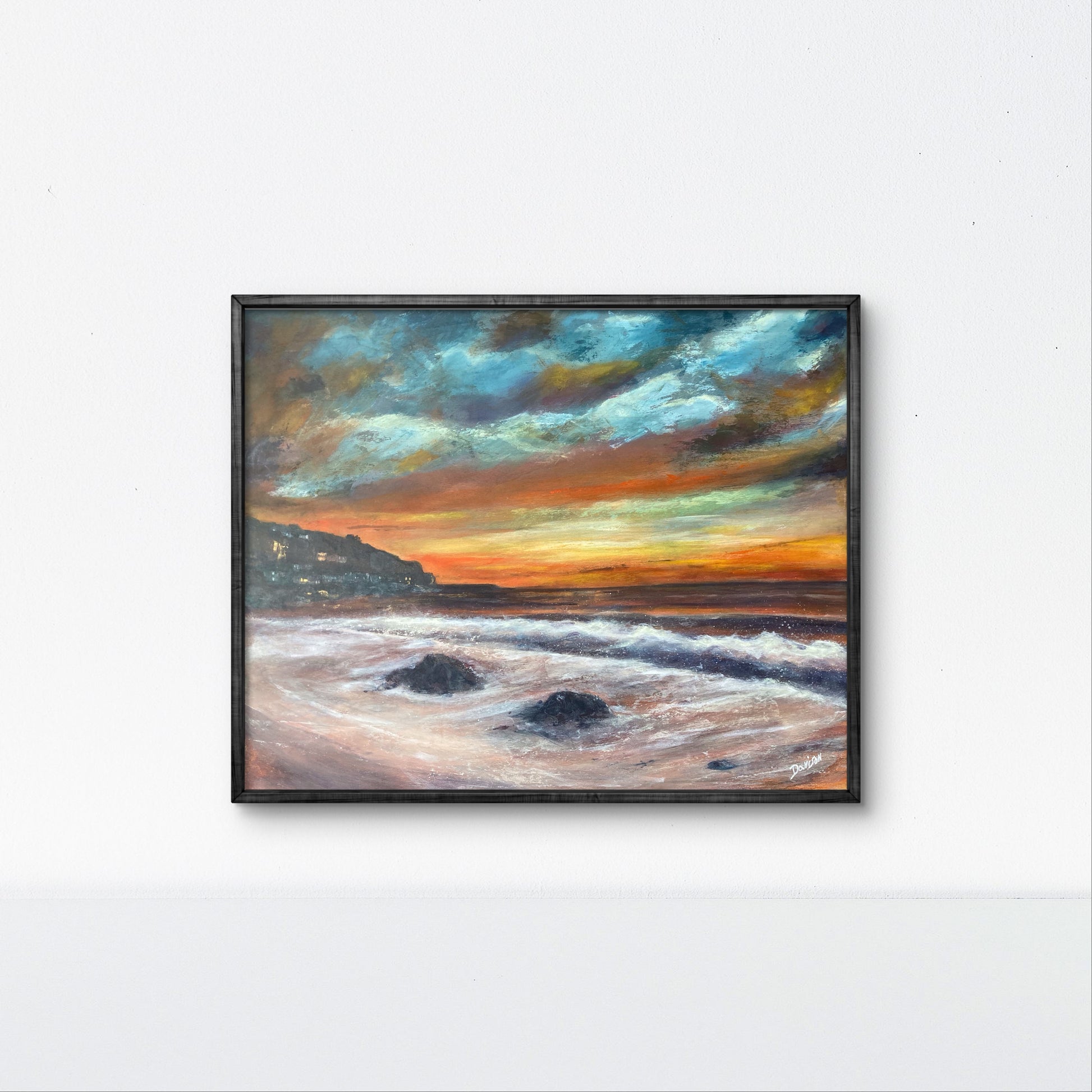 The western Cornish coast is renowned for some of the most amazing sunsets. This original acrylic painting aims to capture the glorious reds, yellows and golden hues as the sun sets on another day at Sennen Cove. The picture is painted on wooden board and measures 20x16 inches (51x41cm), is framed in a black wooden floating frame and is ready to hang.