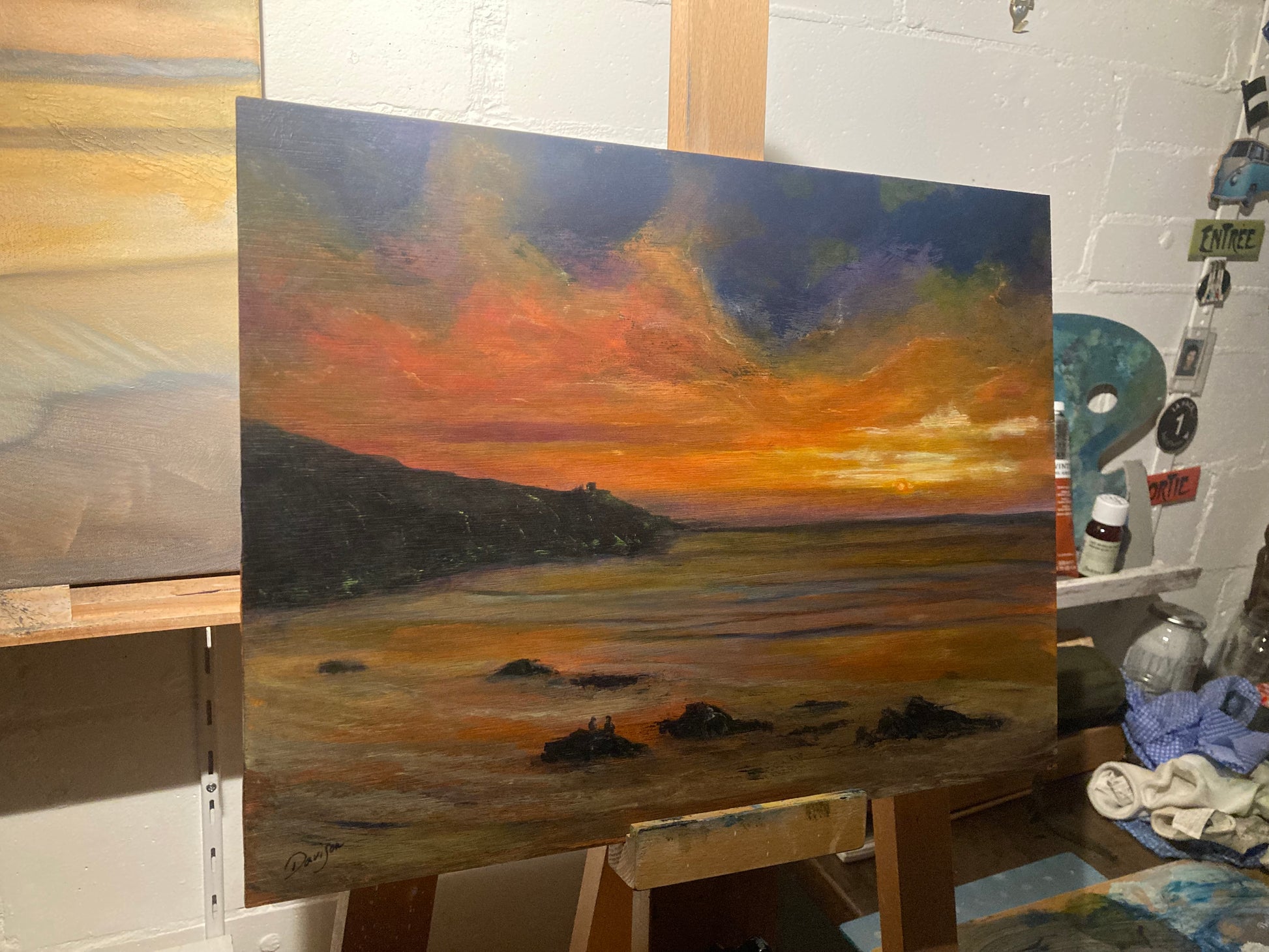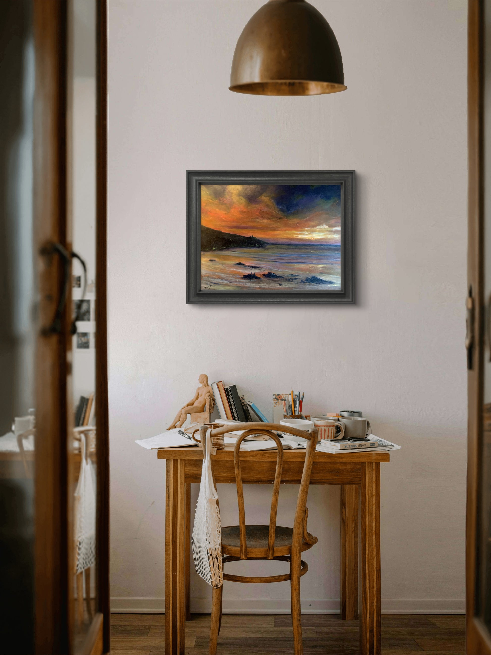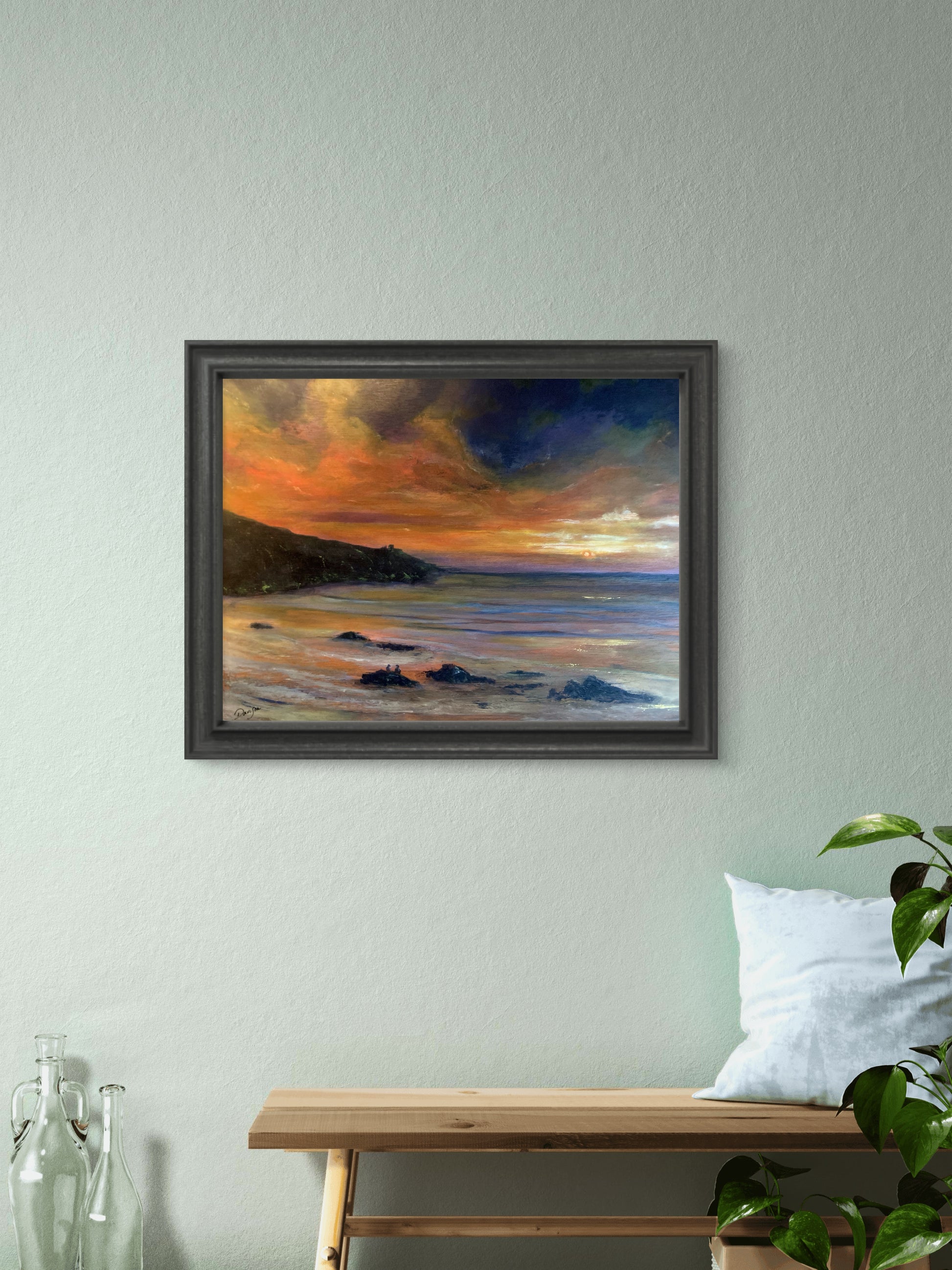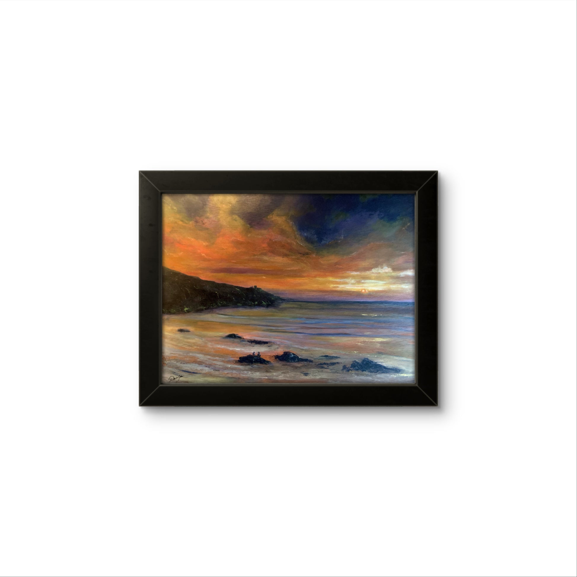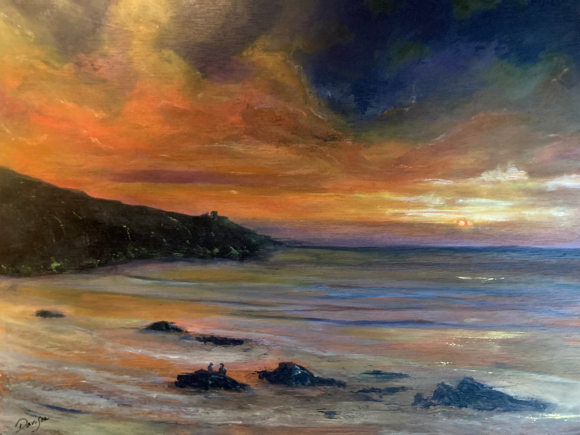 “How lucky are we to watch this delight, as the day closes out and we welcome the night”. Nature at its finest and the inspiration for this original painting by Nick Davison, of a couple watching the sun set on the Cornish coast. It doesn’t get much more romantic than this! The picture measures 16x12 inches (40.6x 30.5cm) is painted in acylic on wooden panel and framed in wood.