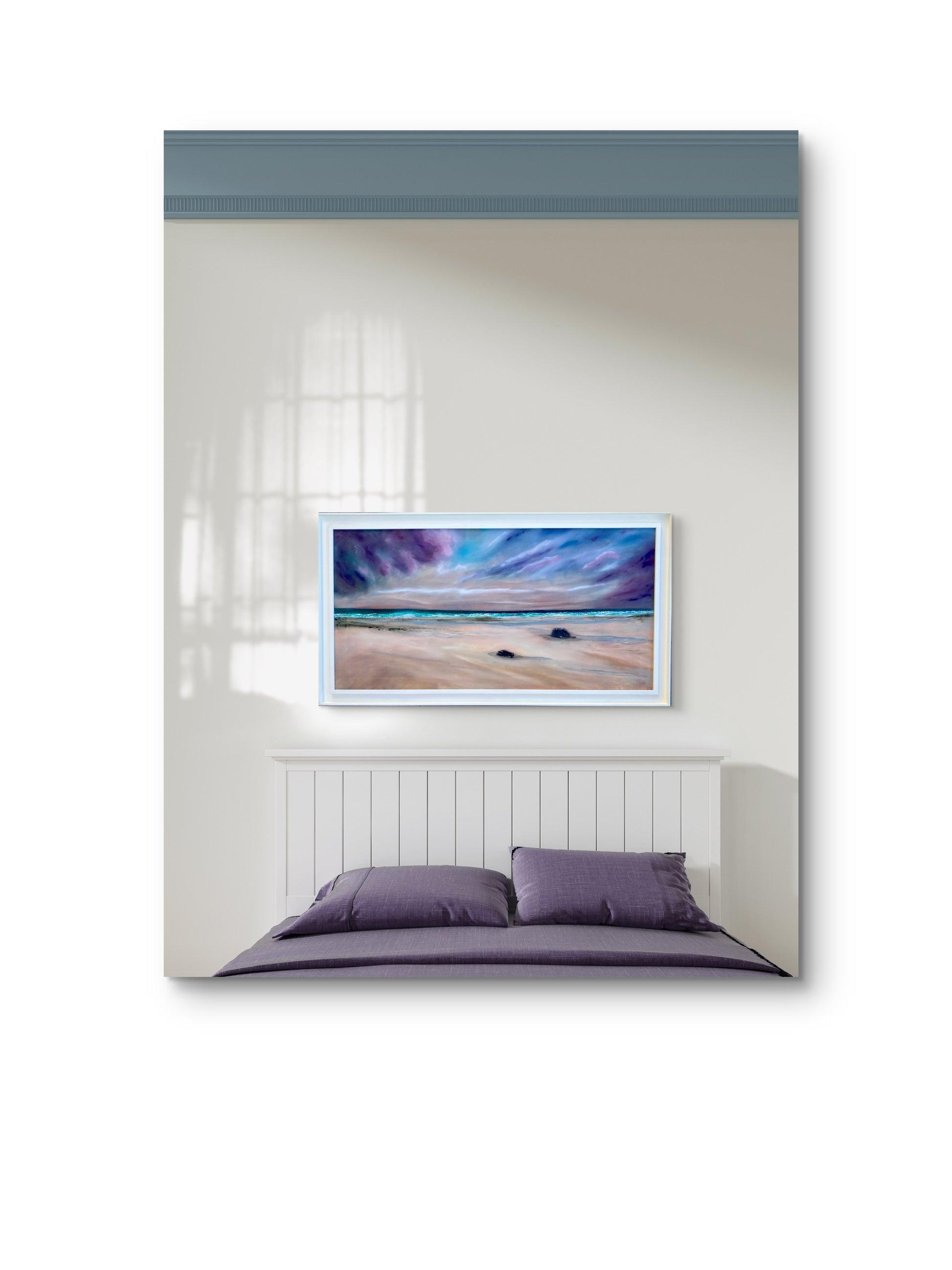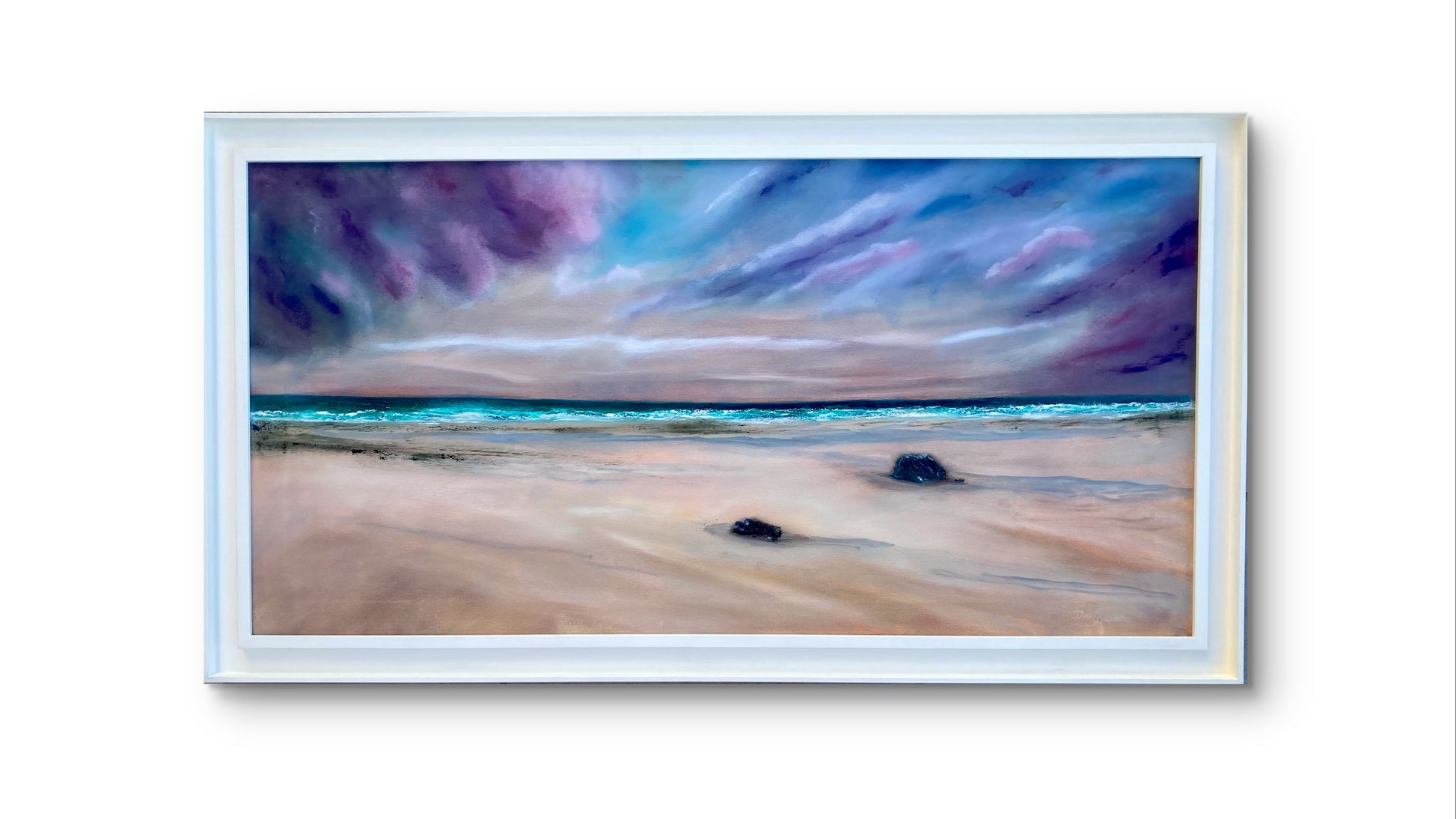 As the oncoming sea breeze drives the sands across the beach, your shins feel the pin like force. Listen carefully and you can just make out the whispers carried on the wind from distant shores. Indecipherable but present all the same. “Whispers on the Wind” is painted in oil on canvas and celebrates the shear beauty of our beaches, seas and skies and the feeling of awe that they create, even on a blustery day. The painting measure 100x50cm, is framed in white wood and is ready to hang.